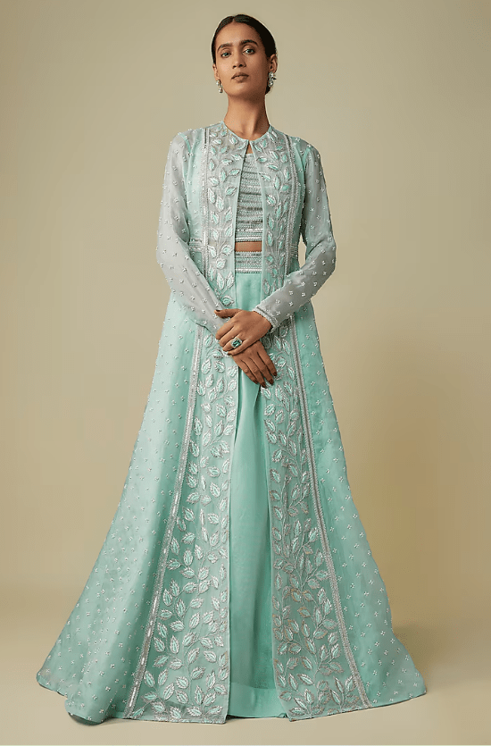 Featuring a blue kalidar jacket in net base with embroidery. It is paired with a blouse having cutdana and salli embroidery, including an organza A-line skirt. Accentuate with statement earrings and heels for weddings or sangeet ceremonies.