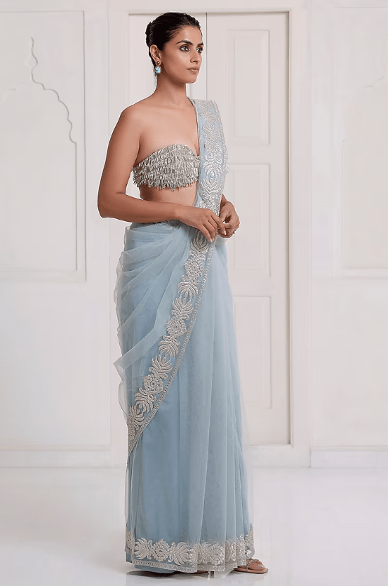 Featuring a blue saree in net base. It is paired with a bralette having cut beads embroidery and an underskirt. Style it with statement earrings and heels for a wedding, sangeet or engagement ceremony.