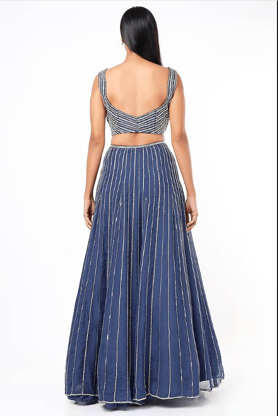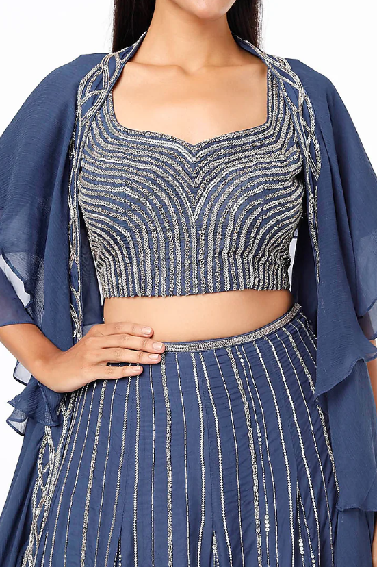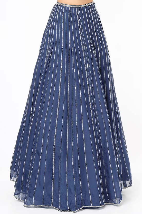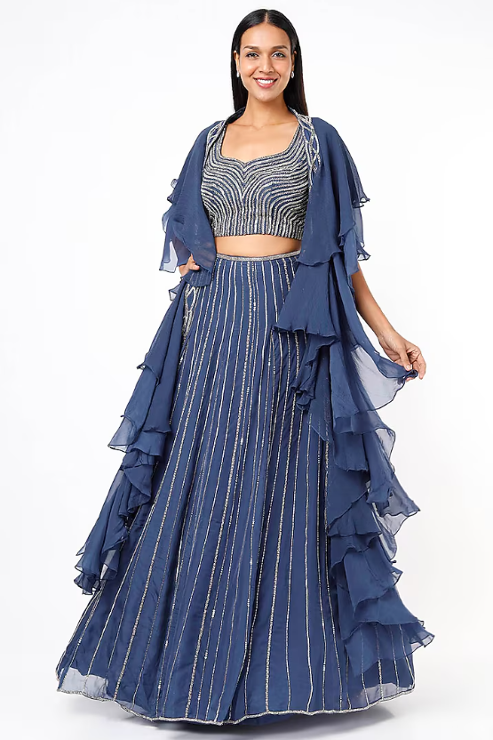 Featuring a blue lehenga in organza base with embroidery. It is paired with a tussar blouse and a chiffon ruffled dupatta. Accentuate this designer set with statement jewellery and heels for a sangeet or engagement ceremony.