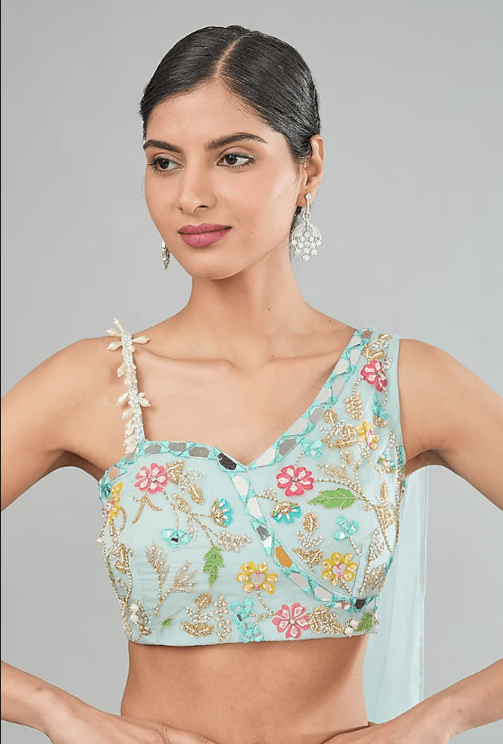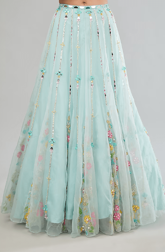 Featuring a blue kalidar lehenga in organza base with hand paint and mirror embroidery. It is paired with a one-shoulder blouse having an attached dupatta and a potli bag. Style it with statement jewellery and heels for weddings or a sangeet ceremony.