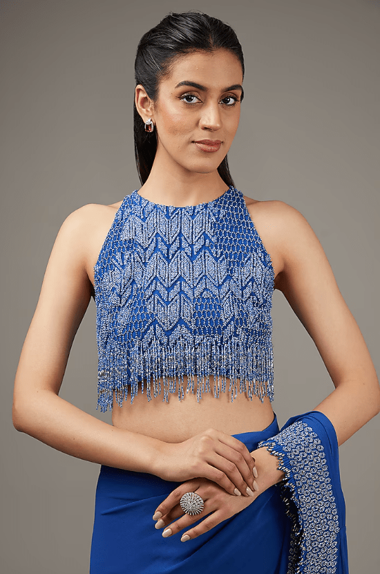 Featuring a blue high waist lehenga in tulle base with bugal tubes, crystal hangings and cut beads embroidery. It is paired with an embroidered blouse. Accentuate it with statement jewellery and heels for a wedding or engagement ceremony.