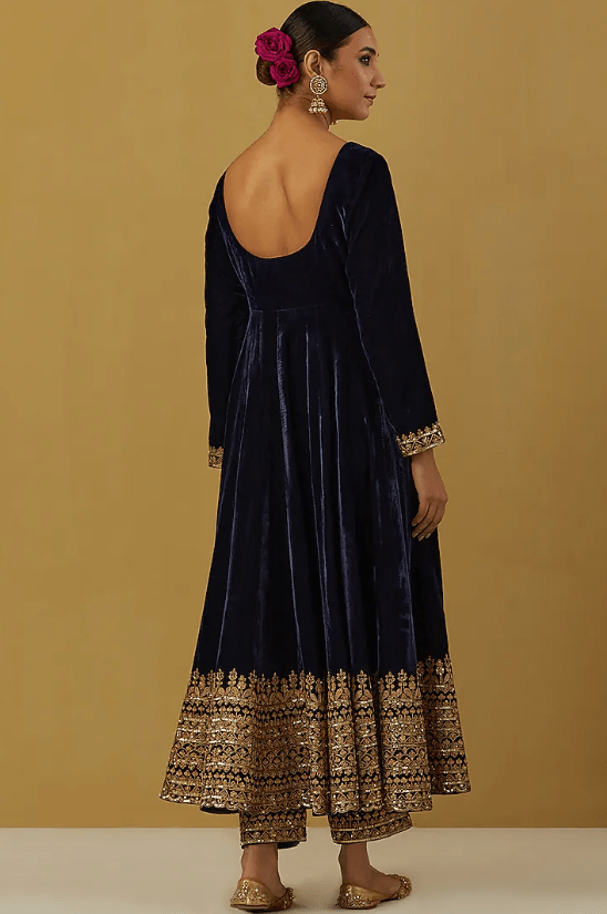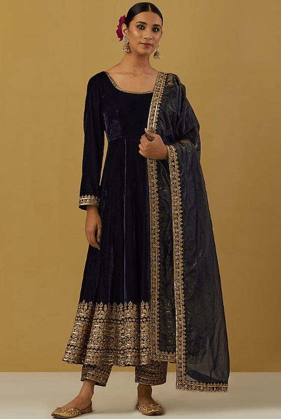 Featuring a blue anarkali in velvet silk base with hand embroidery. It is paired with matching pants and a dupatta