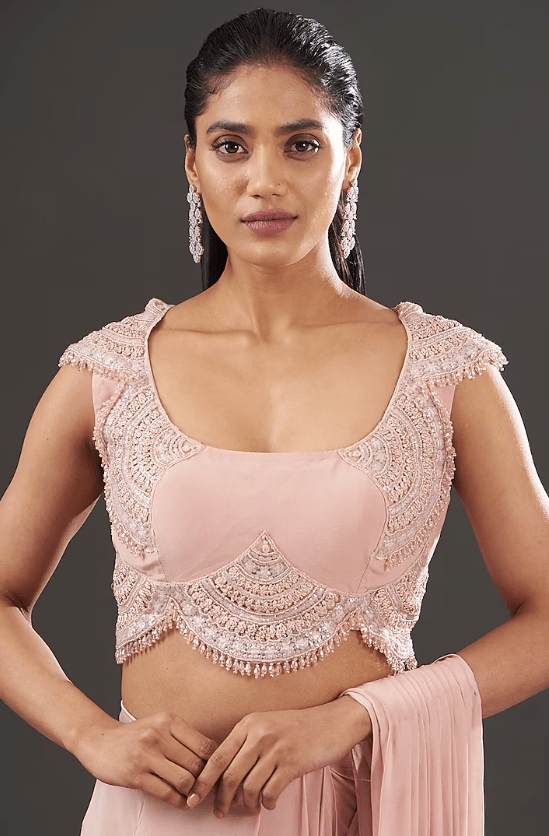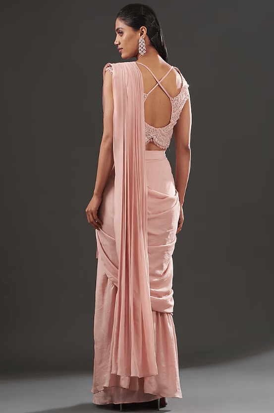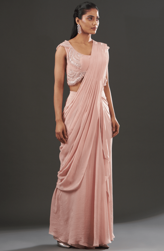 Featuring a blush pink pre-draped saree in chiffon and tulle base. It is paired with a matching aari embroidered blouse. Accentuate it with statement jewellery and heels for a festive wear or evening party.