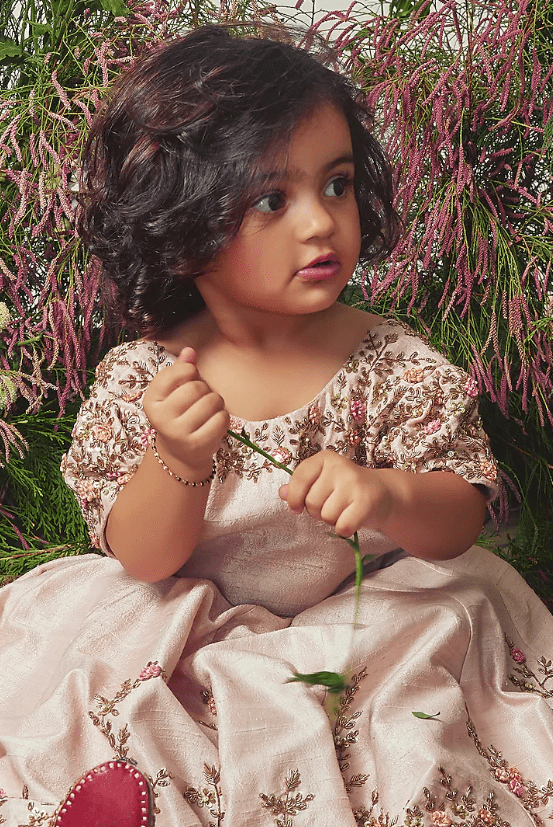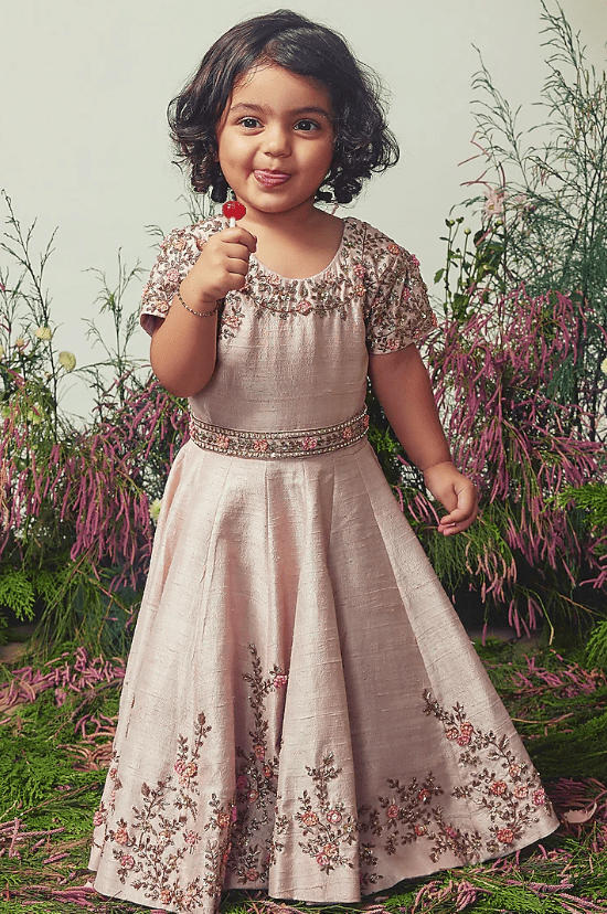 Featuring a blush pink gown for girls in dupion silk base with zardosi embroidery. It is paired with a dori embroidered waist belt. Style it with sandals and cute hair accessories for a wedding or festive occasion.