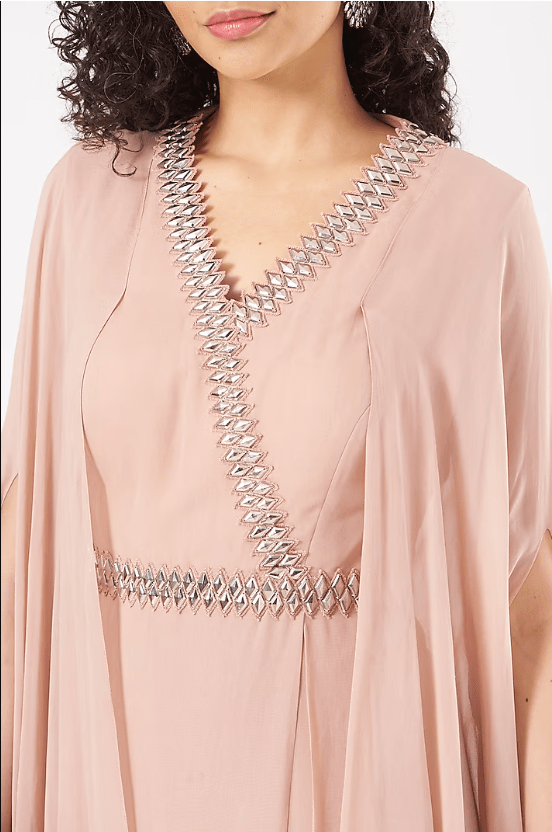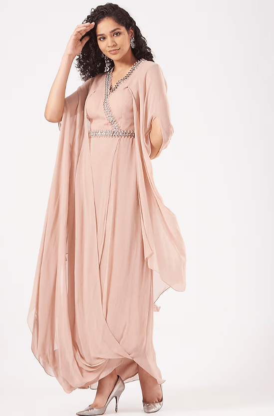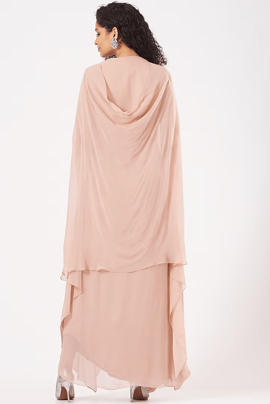 Featuring a blush pink draped gown in georgette base with metallic sequins embroidery.
