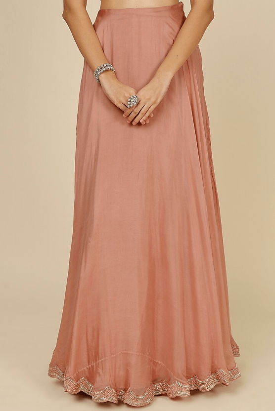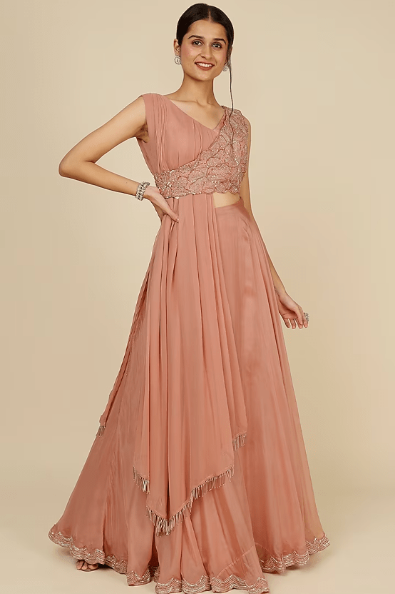 Featuring a blush pink overlap jacket in silk base with abstract floral embroidery and a chiffon drape. It is paired with a matching blouse and an organza lehenga.