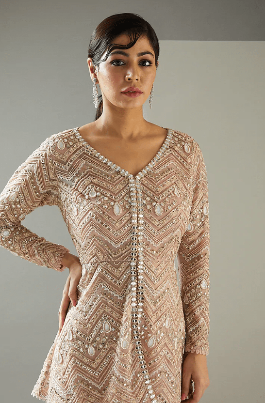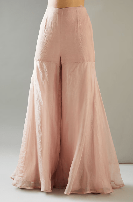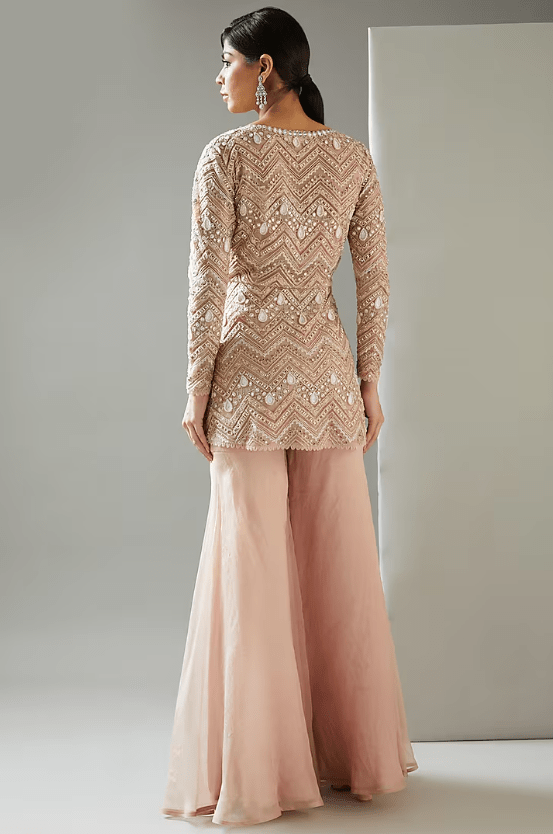 Featuring a blush pink jacket in organza base with hand embroidery. It is paired with matching inner and sharara pants.