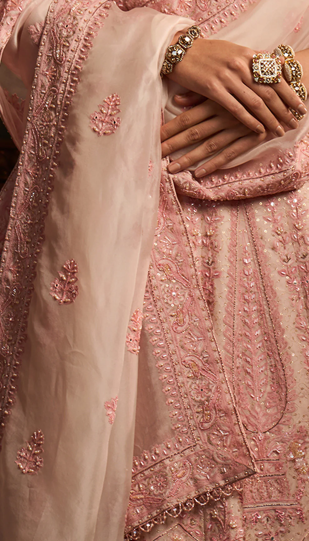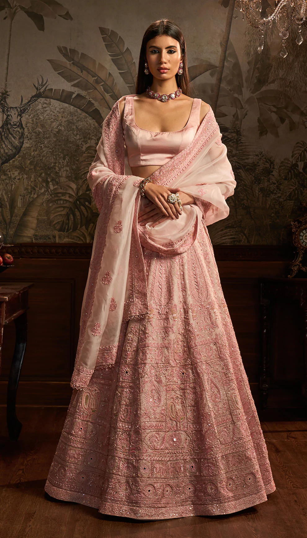 A blush pink organza lehenga with intricate aari embroidery. This is teamed with a satin