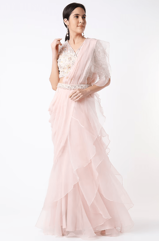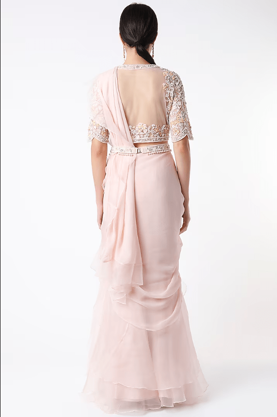 Featuring a blush pink saree in organza base. It is paired with a matching net blouse having embroidery and a belt.