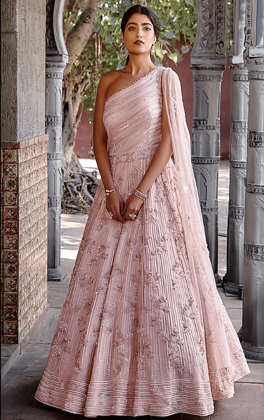 blush pink one-shoulder gown in organza base with an attached net drape including tonal beads, crystals, sequins, and cutdana embroidery. Accentuate this gown with statement jewellery and heels for complete look. Perfect wear for a wedding, sangeet or an engagement ceremony