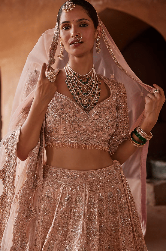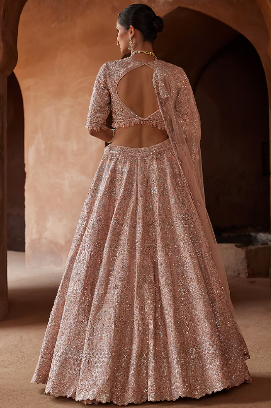 Featuring a blush pink lehenga in raw silk base with applique, dabka, beadwork, and crystal embellishment. It is paired with a choli, a net dupatta, and a belt. Style the lehenga set with statement jewellery and an additional veil for a bridal look. Perfect wear for a wedding ceremony.