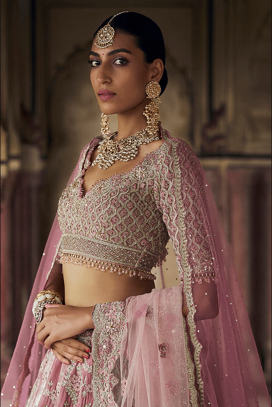 blush pink lehenga in velvet base with dabka, bead, crystal, sequins and kasab embroidery. It is paired with a blouse and a net dupatta. Accentuate it with statement jewellery and heels for a wedding or engagement ceremony.