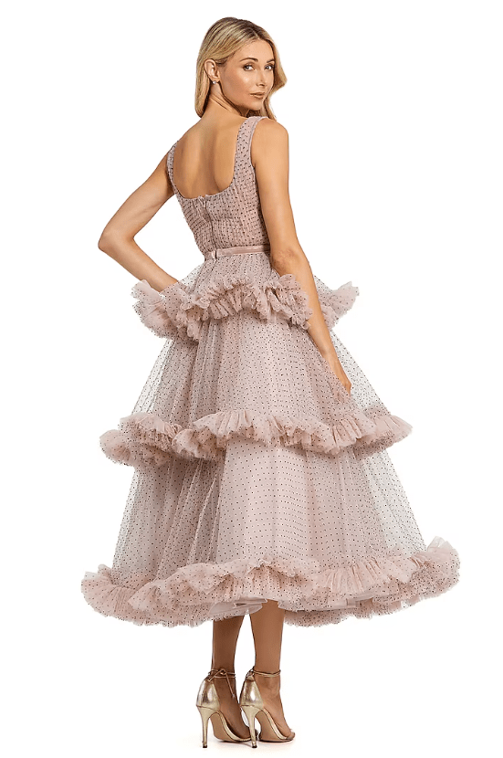 Featuring a blush midi dress in polyester base with flutter sleeves, a square neckline and cascading ruffled detail. Accentuate it with statement earrings and heels for evening soirees or cocktail parties.