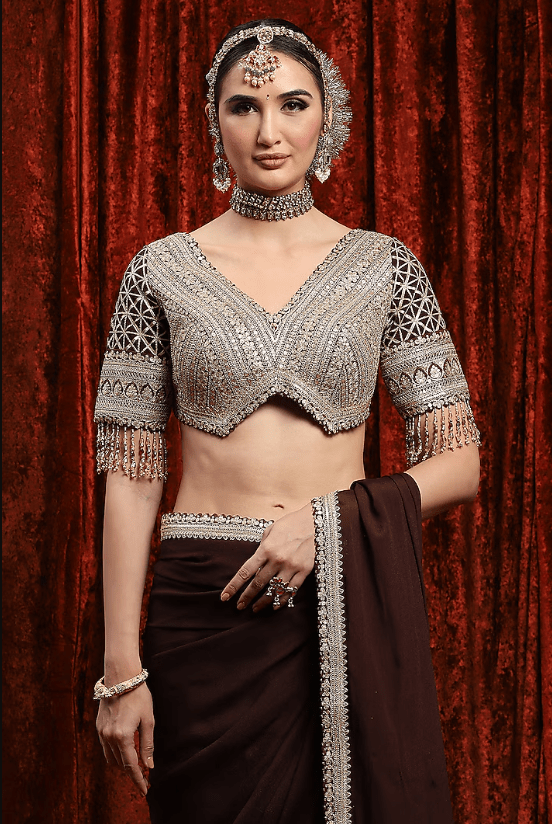 Featuring a brown saree in pure crepe base with gota, dori and badla embellishment. It is paired with a silk chanderi blouse having a V-neckline and a belt. Accentuate it with statement jewellery and heels for weddings or festive occasions.