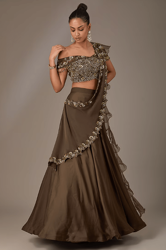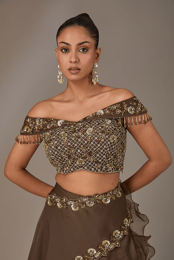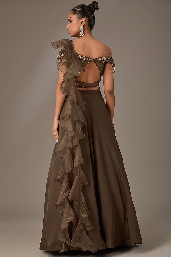 Featuring a brown lehenga in silk base with sequins, cutdana, stone and beads work. It is paired with an embroidered blouse having an attached tissue organza dupatta. Accentuate it with statement earrings and heels for a wedding, engagement or sangeet ceremonies.