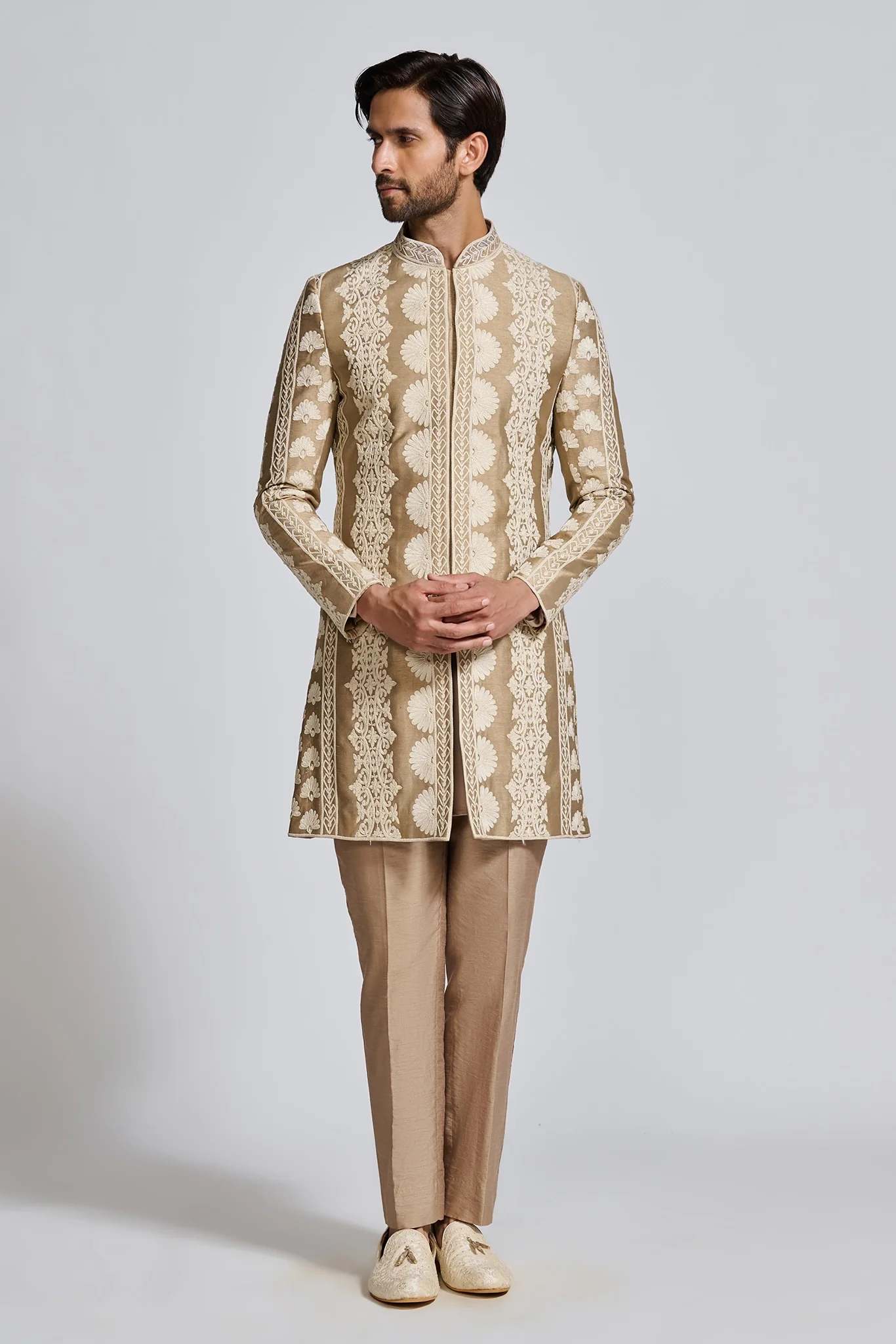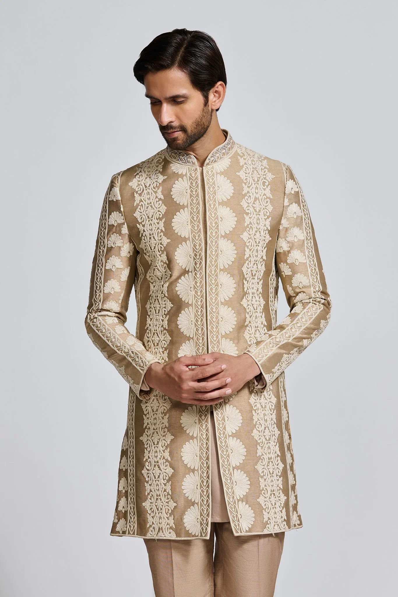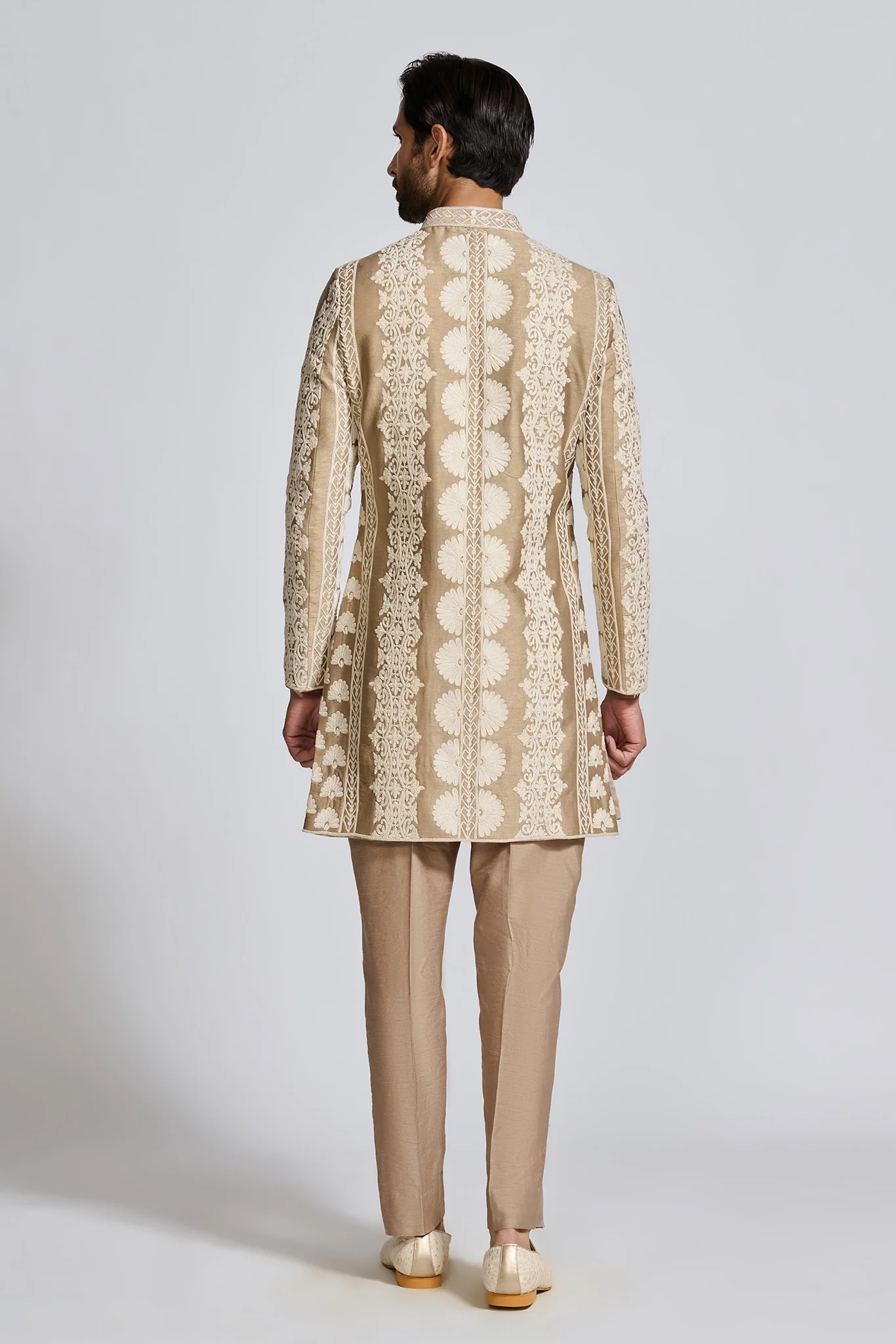 Featuring a brown sherwani, meticulously hand-embroidered on raw silk with ivory threadwork detailing. It is paired with tonal kurta and matching straight pants.