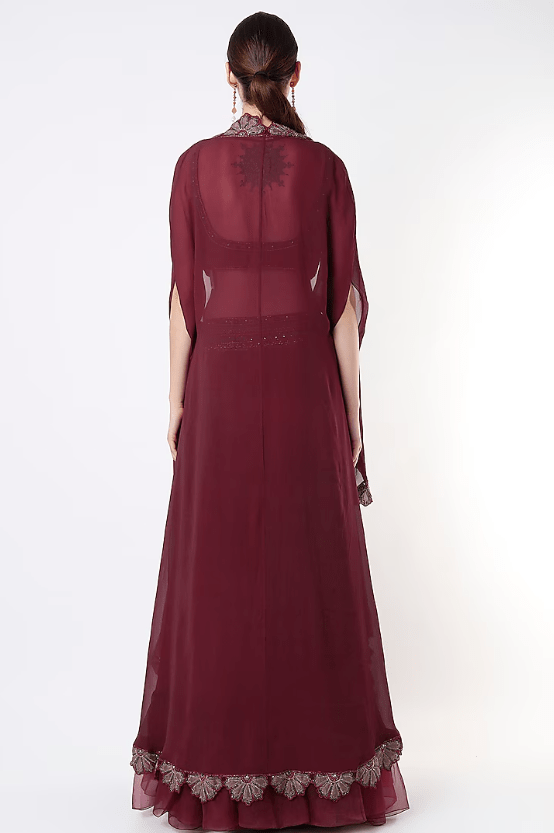 Featuring a burgundy cape in georgette base. It is paired with a matching embroidered blouse in net base and an organza tiered gharara.