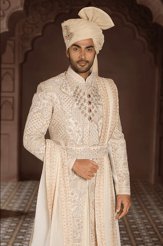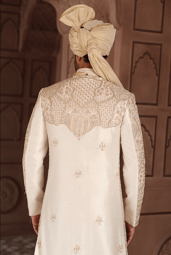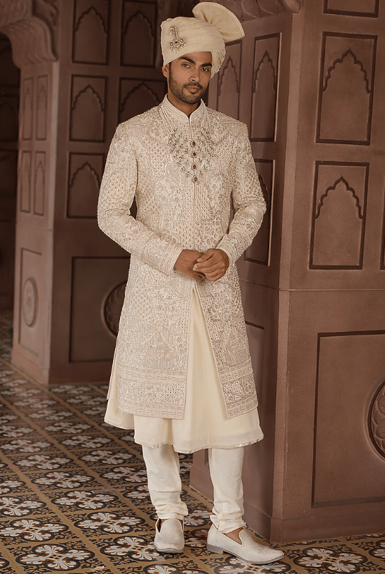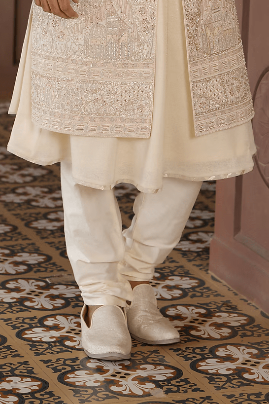 Featuring a butter cream sherwani in silk base with pitta work. It is paired with a kurta and aligarhi pants. Style it with pair of mojaris for a wedding or engagement ceremony.