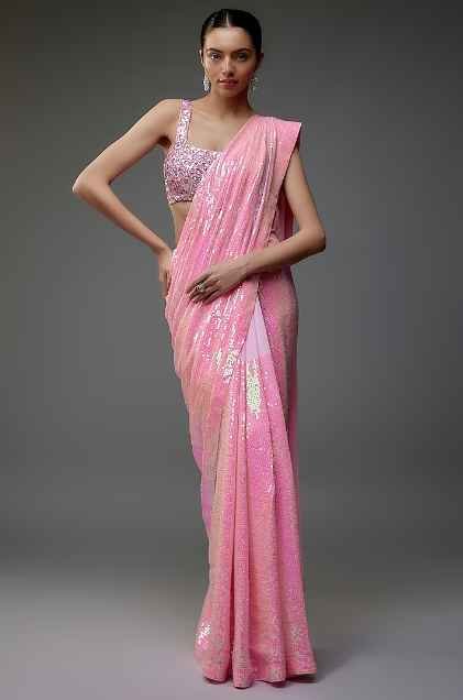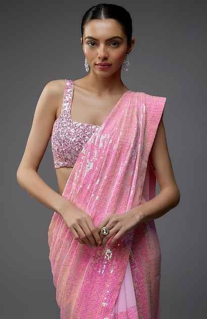 Featuring a candy pink saree in georgette base with sheeted chevron sequins detail. It is paired with a sequins blouse. Style it with statement earrings and heels for a festive or sangeet ceremony.