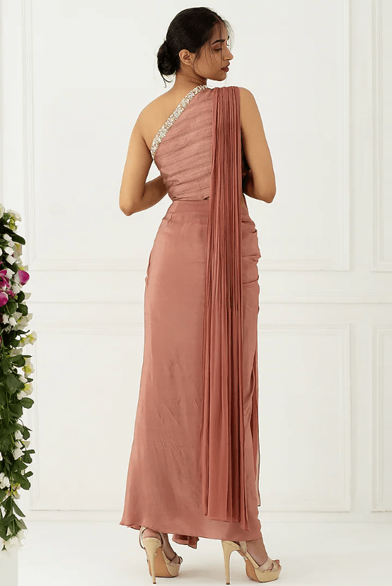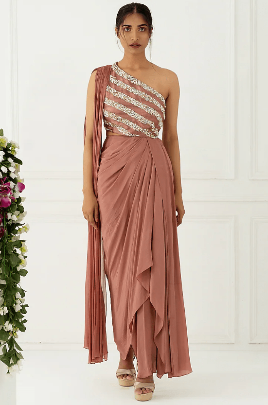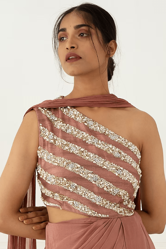 Featuring a cedar one shoulder gown in georgette, crepe, and silk base with sequins, pearls, and stone hand embroidery.