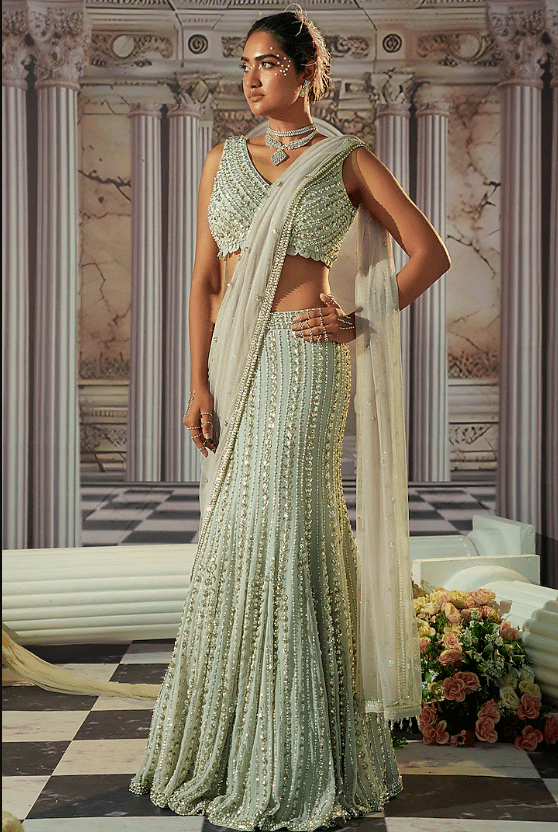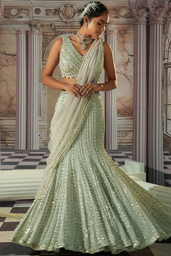 Featuring a celestial silver grey lehenga in georgette and net base with symmetrical bead and sequins embroidery. It is paired with a blouse and an embroidered dupatta. Accentuate with statement earrings and heels for a wedding or engagement ceremony.