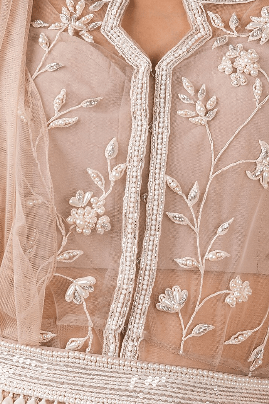 Featuring a champagne gold lehenga skirt in raw silk and net base with pearl embroidery. It is paired with a matching peplum top and net dupatta having organza ruffles.