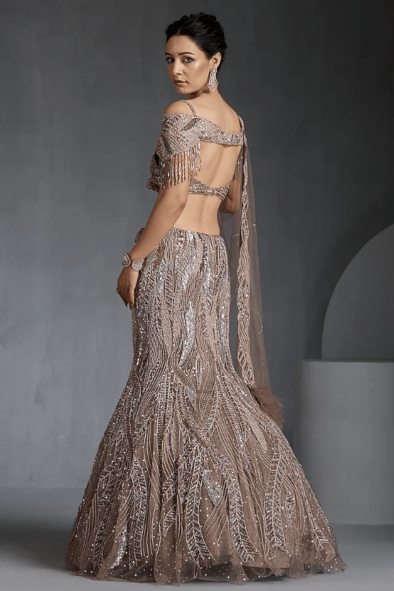 Champagne Net Sequins & Zirconss Embellished Lehenga Set