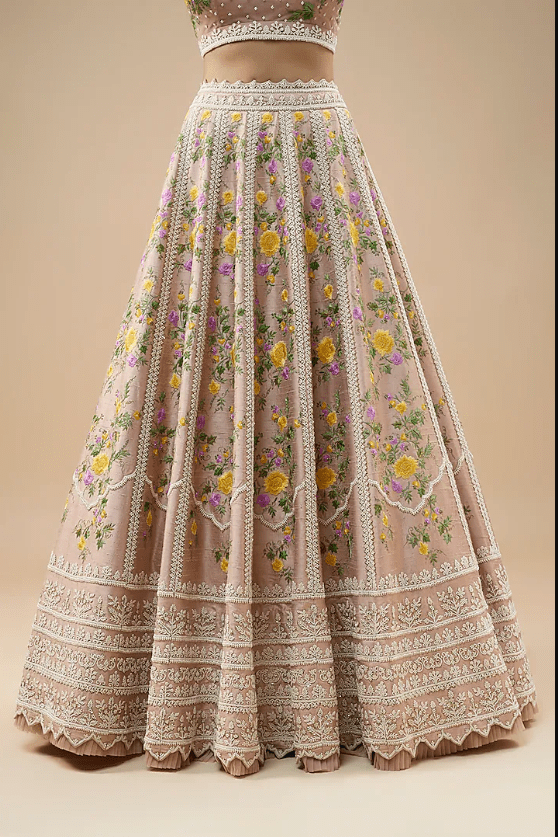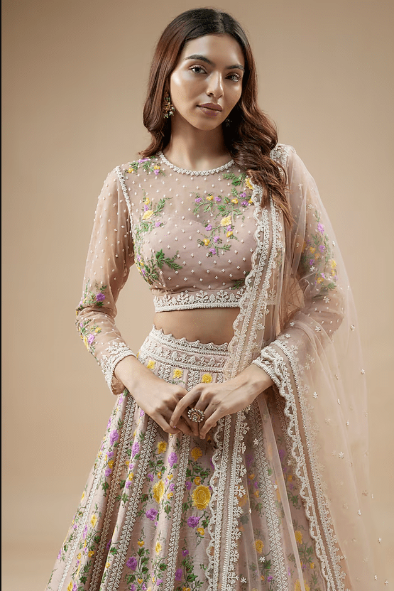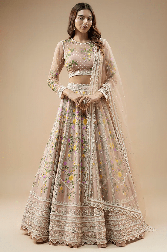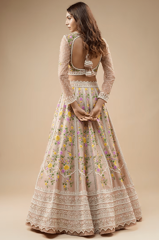 Featuring a champagne lehenga in raw silk base with pearl, thread hand and machine embroidery. It is paired with a blouse and a net dupatta. Accentuate it with statement jewellery and heels for a wedding or engagement ceremony.