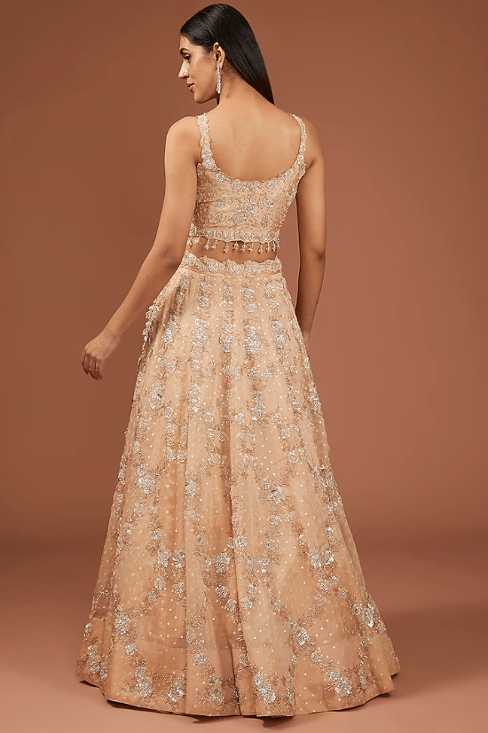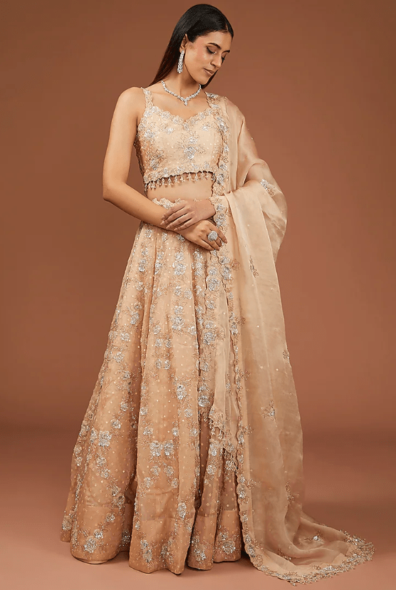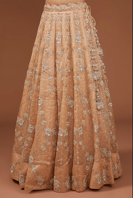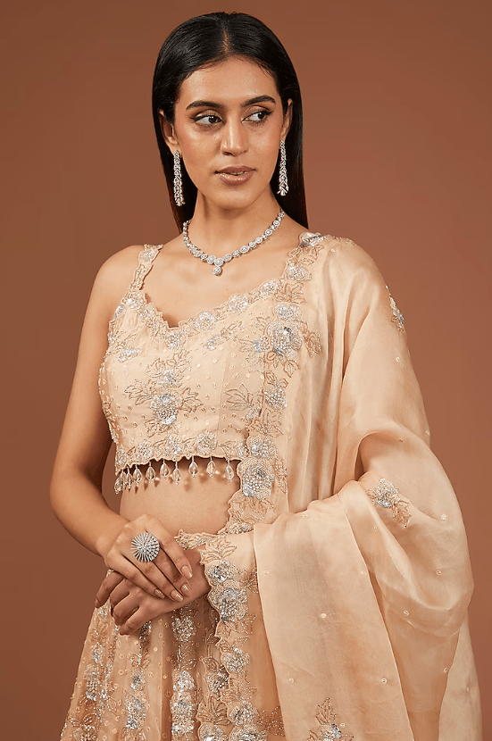 Featuring a champagne lehenga in satin organza base with sequins and cutdana work. It is paired with a spun silk blouse and a dupatta. Accentuate it with statement earrings and heels for a wedding or engagement ceremony.