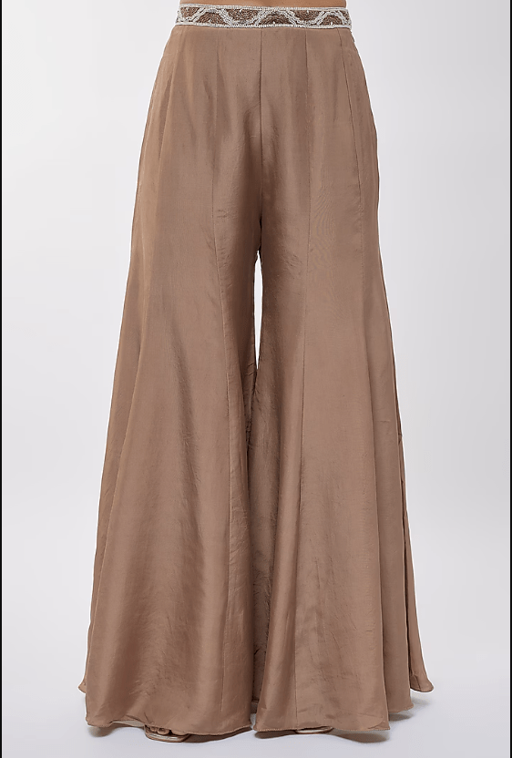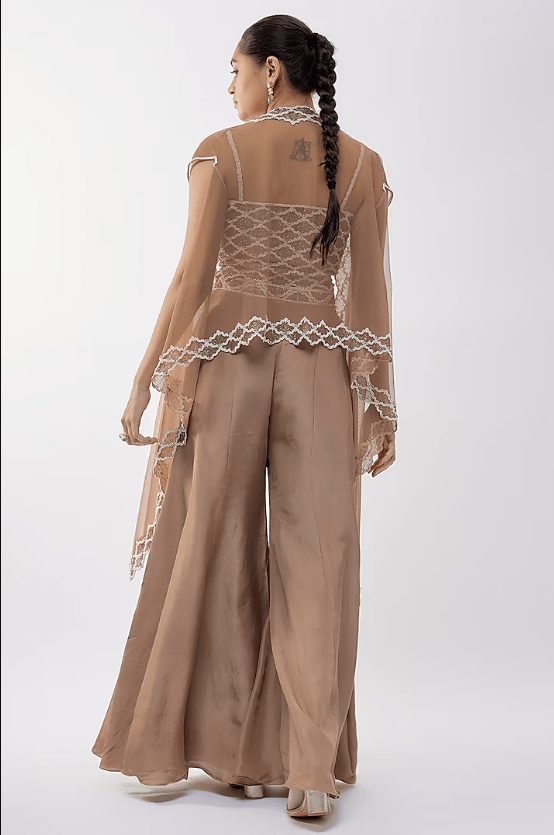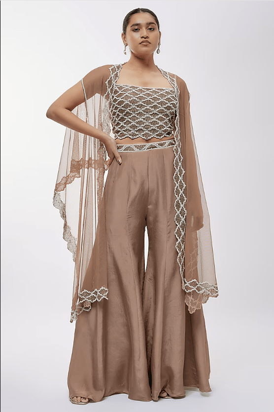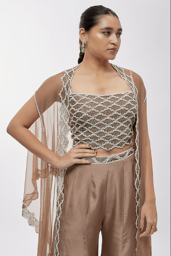 Featuring a champagne cape in net base with pearl and cutdana work. It is paired with a bustier and satin silk sharara pants. Accentuate with dangler earrings and heels for sangeet ceremonies.