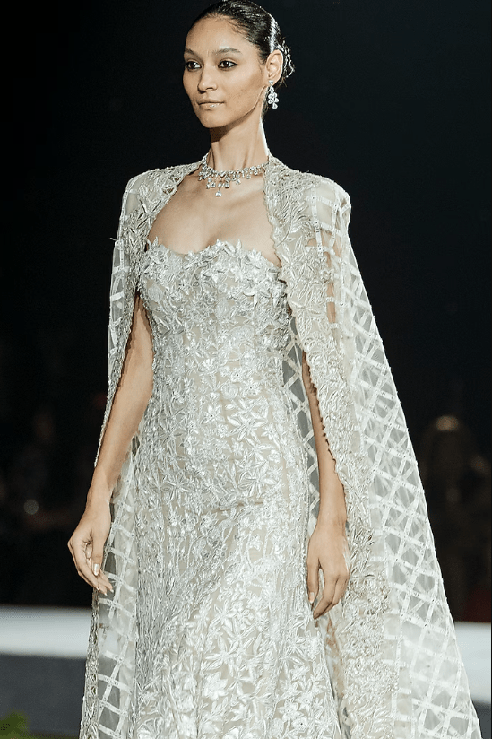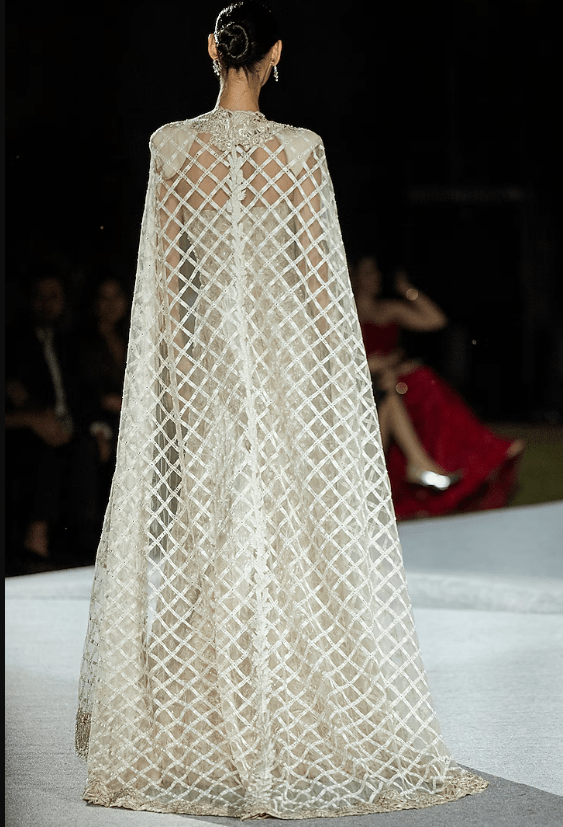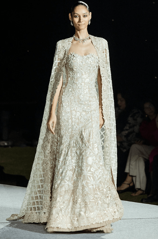 champagne gown in tulle base with floral detail. It is paired with a cape. Accentuate it with metallic block heels and contemporary jhumkas to bring a daring twist to traditional sangeet styling.