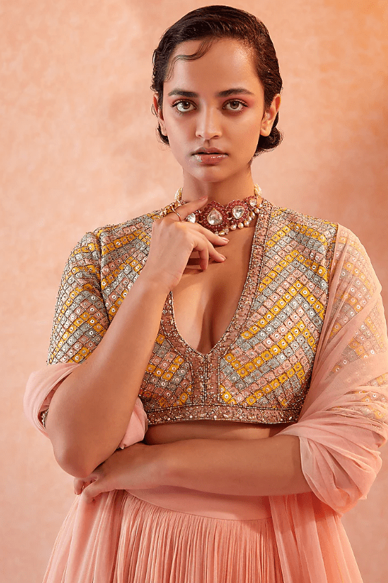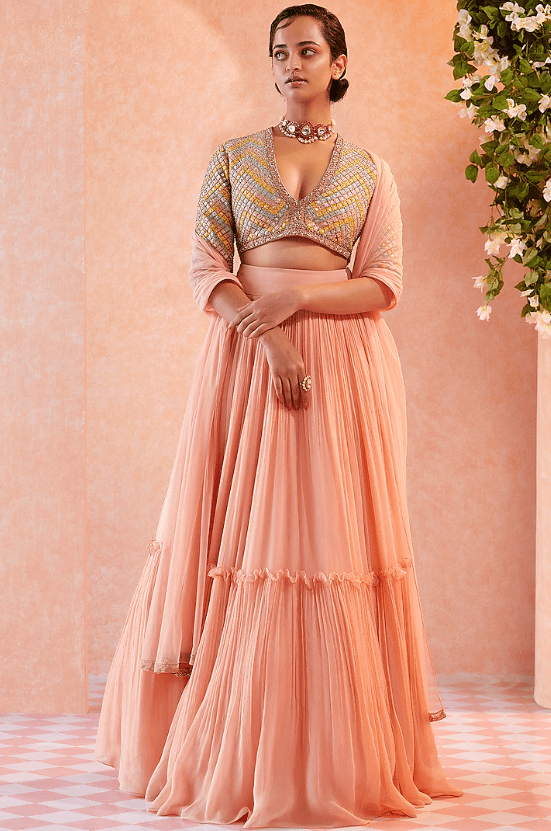 Featuring a champagne two tiered skirt in chiffon base. It is paired with a contrasting multicolored embroidered blouse and a dupatta in net base.