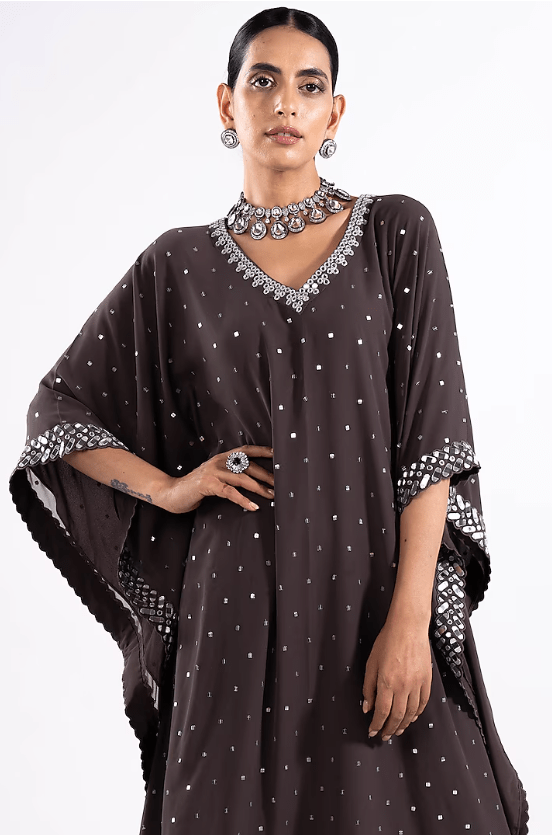 Featuring a charcoal grey kaftan in georgette base with hand-cut mirror and cheetah work. It is paired with matching palazzo pants.