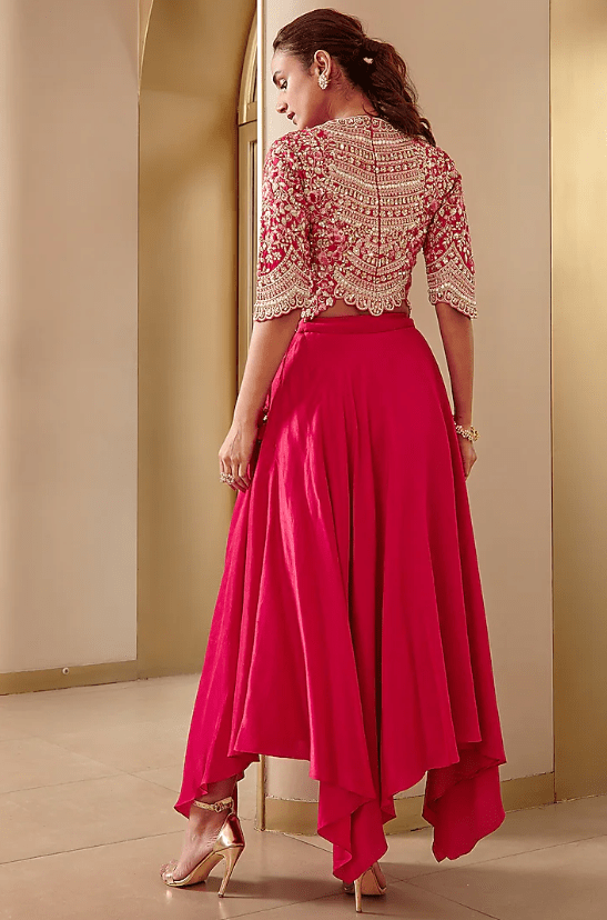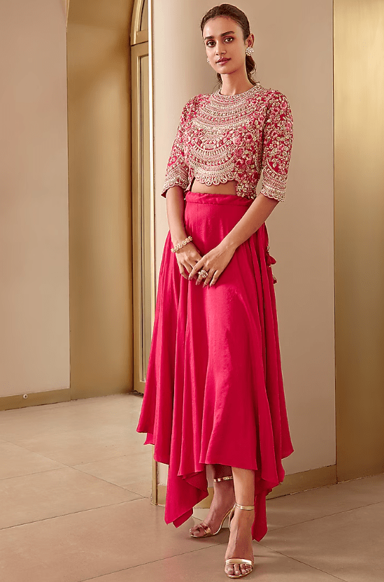 Featuring a cherry red crop top in mulberry silk base with zardosi and thread embroidery. It is paired a with matching asymmetrical skirt.