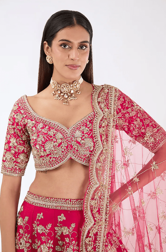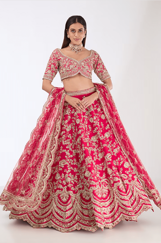 Featuring a cherry red lehenga in raw silk base with thread, cutdana, hand and machine embroidery. It is paired with a blouse and two dupattas. Accentuate statement jewellery and heels for weddings or a bridal look.