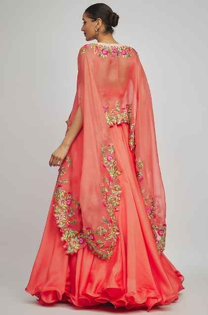 Featuring a coral cape in organza base with thread embroidery. It is paired with a chanderi crop top and a skirt. Accentuate with statement jewellery and heels for a wedding or festive occasion.