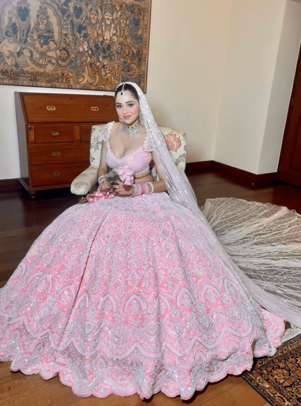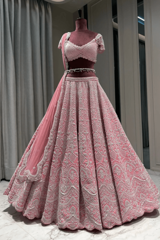 Reverie Bridal set is a stunning coral pink lehenga hand embroidered on pure raw silk fabric with signature glass crystals, pearls, sequins and bead and has scalloped edges on the lehenga. Its paired with a attractive hand embroidered blouse with cap sleeves on net fabric. It comes with a peachy pink soft net scalloped dupatta, a gorgeous soft net trail dupatta and pearl belt which enhances the entire look.