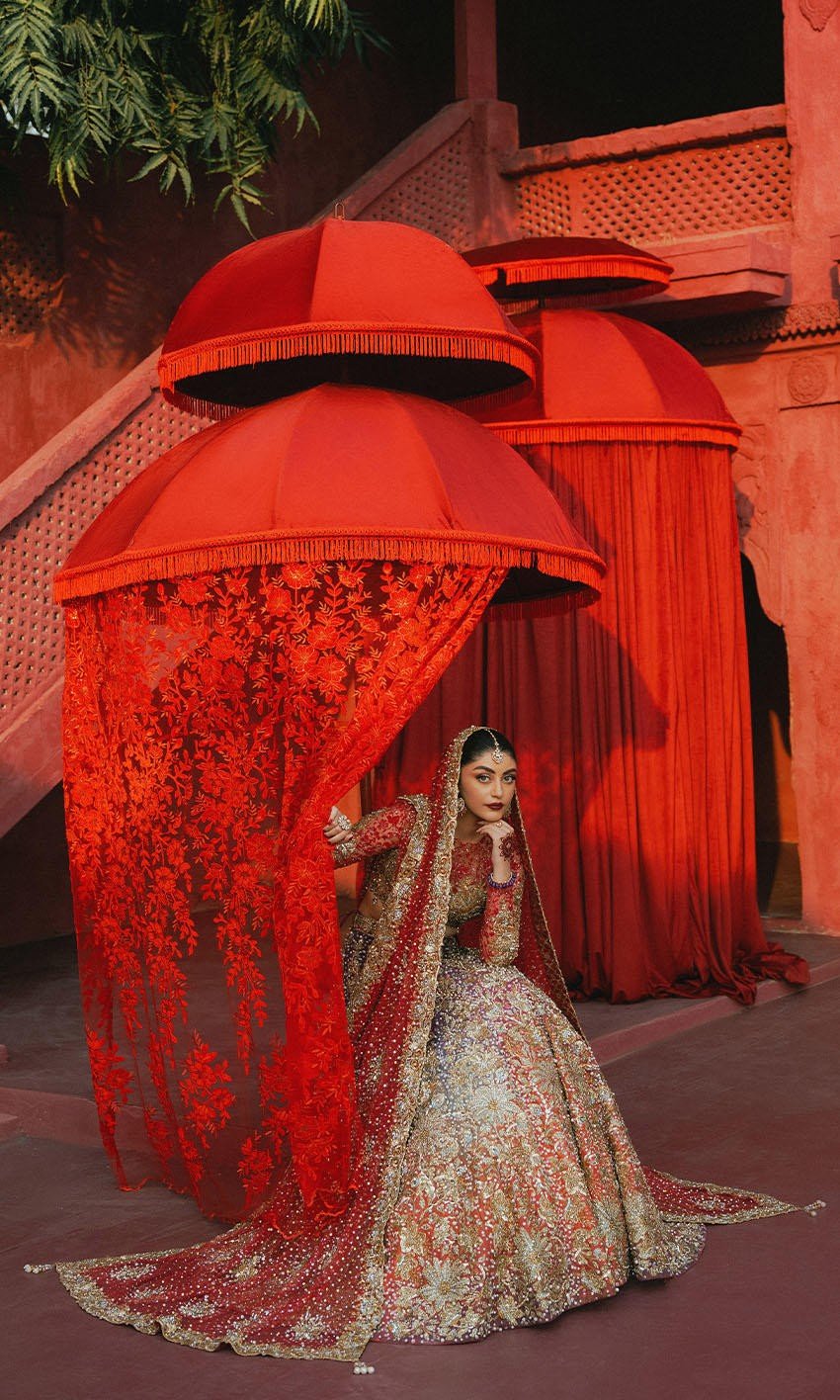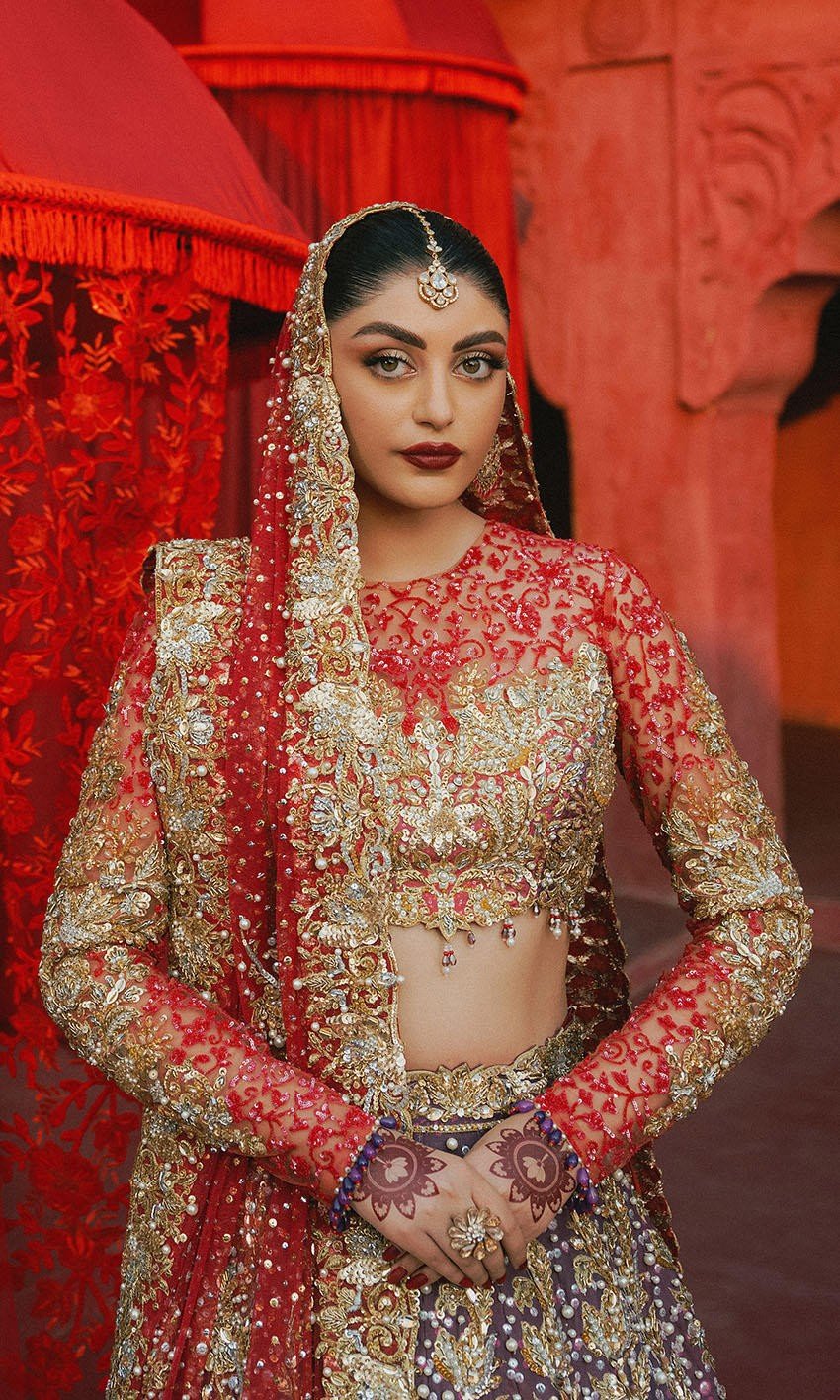 A breathtaking coral, purple, and pink ombre lehnga adorned with intricate gold and sequin work, paired with a sheer net choli that exudes elegance. The look is completed with a soft net dupatta featuring delicate white pearl detailing and shimmering sequin accents.