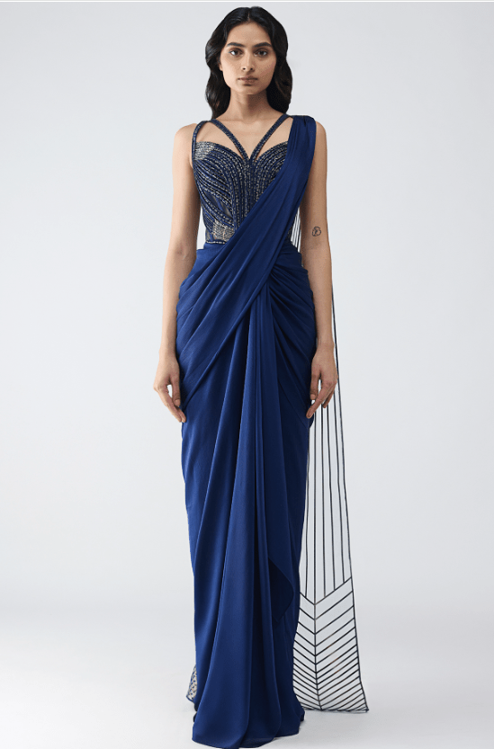Featuring a cosmos draped saree in satin chiffon and butterfly net base with metallic sunray palla. It is paired with a banarasi corded corset. Accentuate it with statement jewellery and heels for cocktail parties.