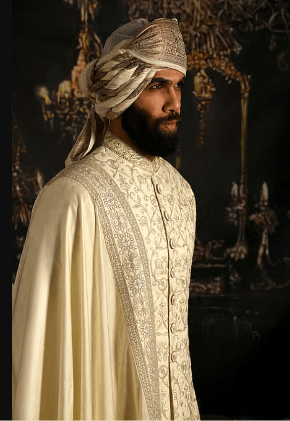 Cream silk sherwani with intricate embroidery and carved-motif detailing. Paired with a pyjama and satin silk dupatta.