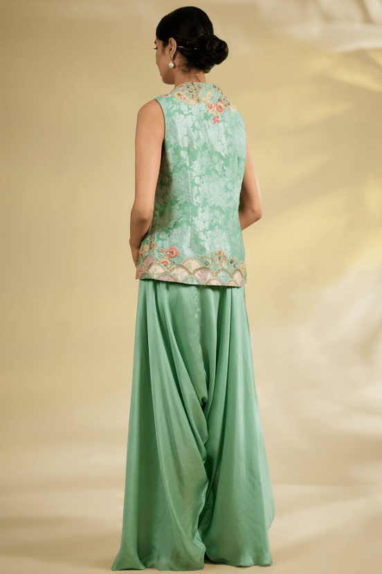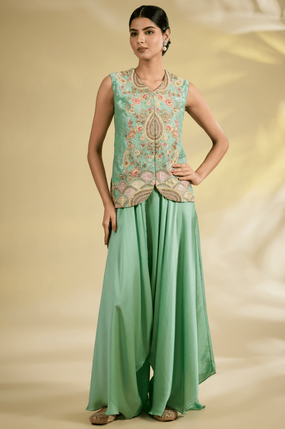 Featuring a cyan cape in organza, satin and chanderi base with patchwork. It is paired with a short jacket and pants. Accentuate it with statement earrings and heels for a festive occasion, sangeet or engagement ceremony.
