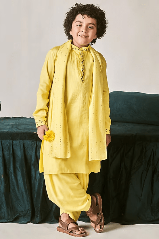 Featuring a daffodil yellow kurta for boys in vegan silk vortex base with floral thread embroidery. It is paired with pants and a sequins hand embroidered dupatta. Perfect attire for a haldi or festive occasion.