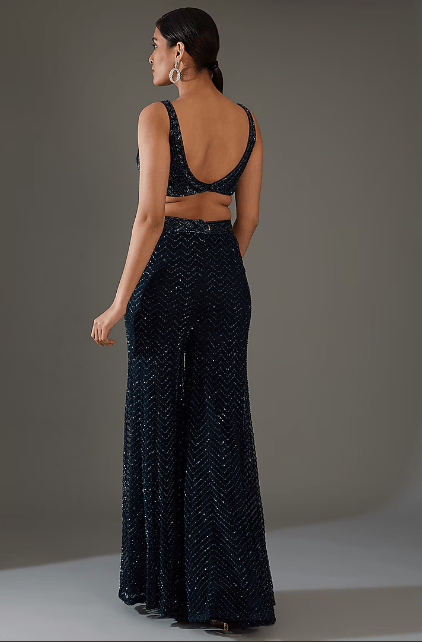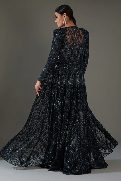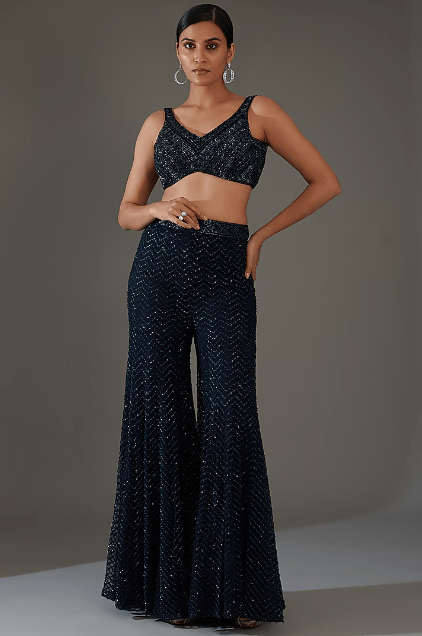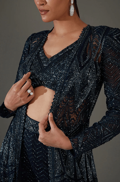 Featuring a dark blue cape in net, double georgette and crepe base with crystal bugles and thread embroidery. It is paired with a bustier and sharara pants. Style it with dangler earrings and heels for a wedding, sangeet or engagement ceremony.