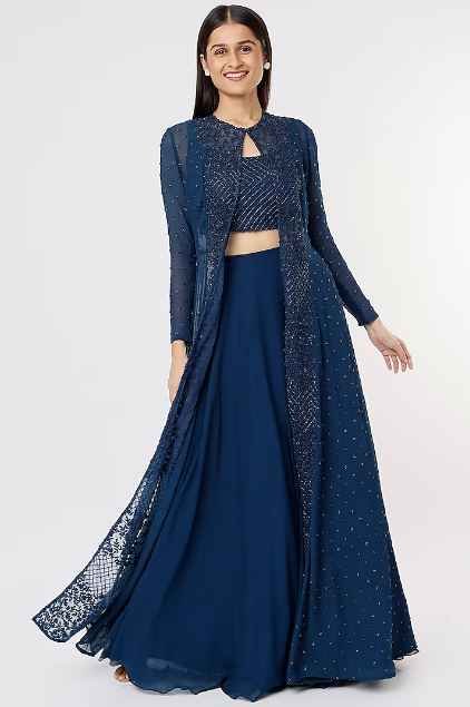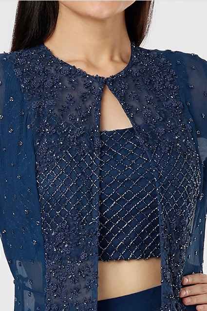 Featuring a dark blue jacket in organza base with pearl hand embroidery. It is paired with a matching flared skirt and a blouse.