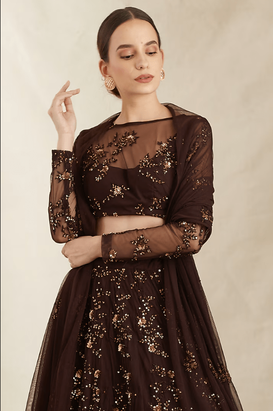 Dark Coffee Net Thread Embroidered Lehenga Set