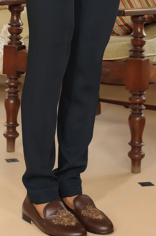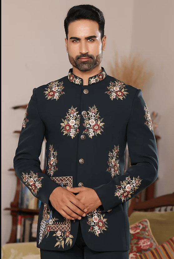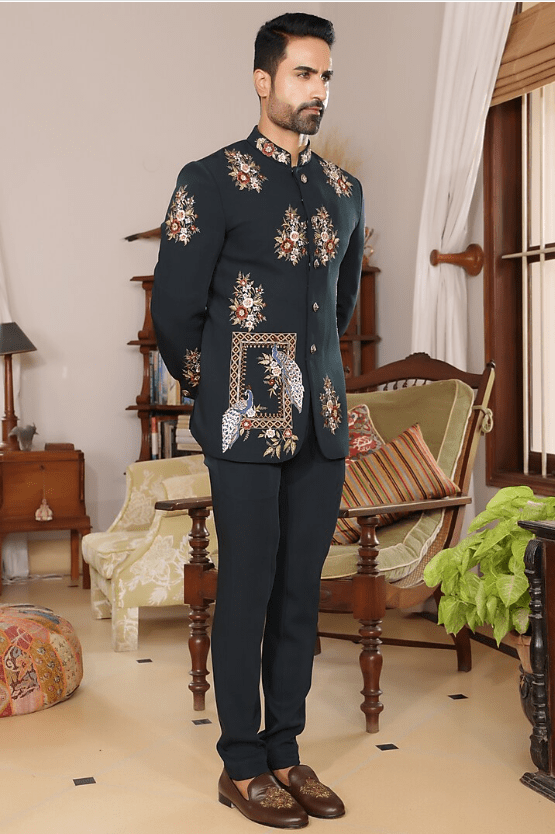 Featuring a dark green bandhgala in japanese lycra base with machine and hand embroidery. It is paired with trousers. Perfect wear for pre-wedding ceremonies.