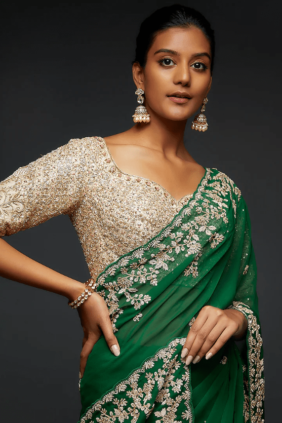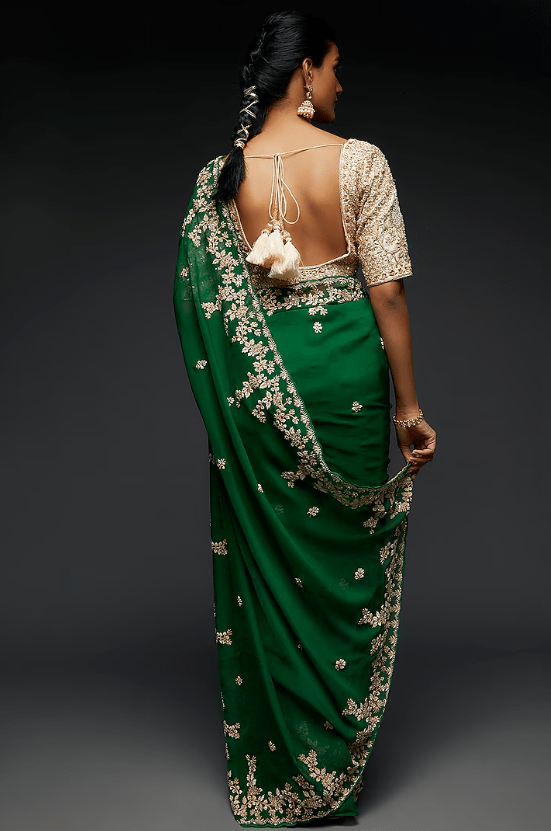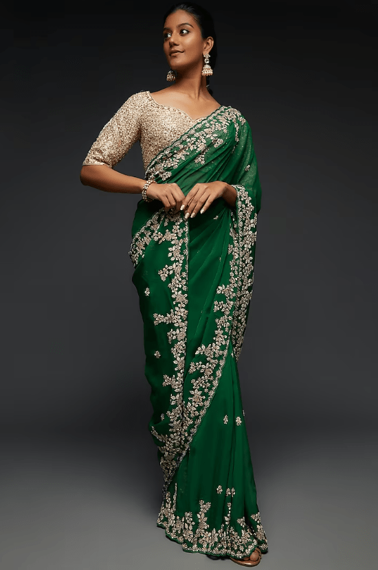 Featuring a dark green saree in pure organza base with dabka, cutdana, and sequins embroidery. It is paired with a matching unstitched blouse piece.