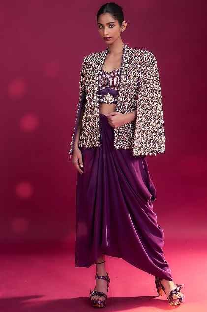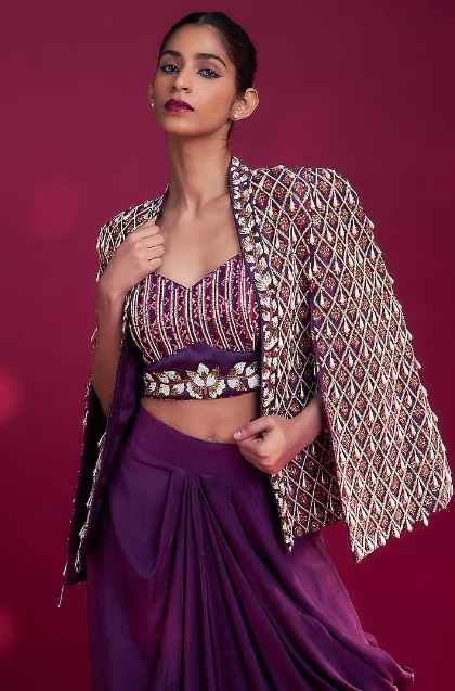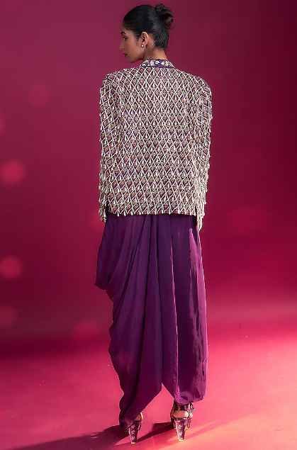 Dark Purple Dhoti Skirt Set that captivates with its elegance. The eye-catching handcrafted jacket is crafted in pure mashru silk with ajrakh print, including sequins and bead work. It is paired with a handcrafted blouse and a pure natural crepe draped dhoti skirt. Accessorize the designer dhoti skirt set with statement earrings and heels for weddings or sangeet ceremonies, showcasing style and sophistication.