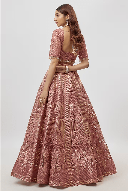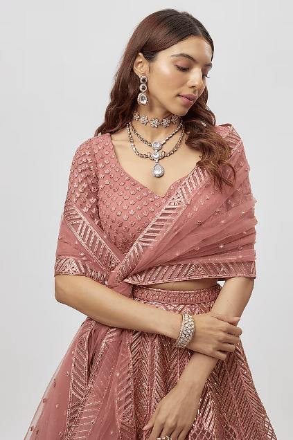 Featuring a dark rose pink lehenga in net base. It is paired with a blouse and a dupatta. Accentuate it with statement jewellery and heels for wedding or sangeet ceremonies.