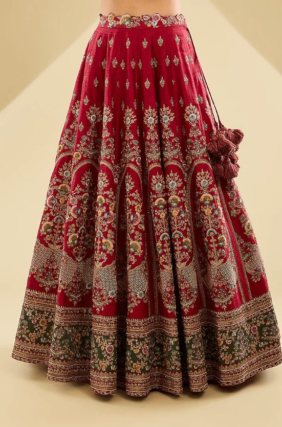 Featuring a deep red lehenga in dupion base with patchwork. It is paired with a blouse and an organza dupatta. Accentuate it with statement earrings and heels for a wedding or engagement ceremony.